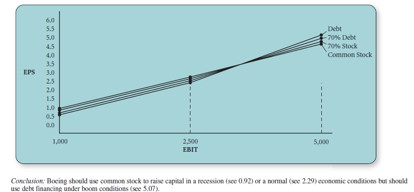 In the Boeing graph, notice that there is a breakeven point between the normal and boom range of EBIT where the debt option overtakes the 70/30 D/S option as the best financing alternative. A breakeven point (where two lines cross each other) is the EBIT level where various financing alternatives represented by lines crossing are equally attractive in terms of EPS. The Boeing graph indicates that EPS values are highest for the 100 percent debt option at high EBIT levels. The graph also reveals that the EPS values for 100 percent debt increase faster than the other financing options as EBIT levels increase beyond the breakeven point. At low levels of EBIT, however, the Boeing graph indicates that 100 percent stock is the best financing alternative because the EPS values are highest.