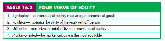 The four views of equity in Table 16.2 move roughly from most to least egalitarian. While the egalitarian view explicitly requires equal allocations, the Rawlsian puts a heavy weight on equality (otherwise, some people would be much worse off than others). The utilitarian is likely to require some difference between the best- and worst-off members of society. Finally, the market-oriented view may lead to substantial inequality in the allocations of goods and services.