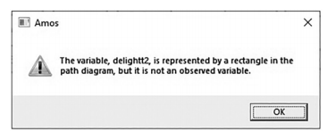 - Not an observed variable message—one of the messages you might receive from AMOS is that your observed variable cannot be found in the data. In our CFA example, we had a measurement indicator that was named “delight2”. If I misspelled this name during the input to “delightt2”, there is no data that matches that exact name. Hence, AMOS will give you an error message that you have a variable in a square/rectangle and it has no data associated with that variable name.You can also get the “not an observable variable” mes- sage if the variable name is correct, but there is no data under that name in the data file. If the column under that name is blank, you will get this message.