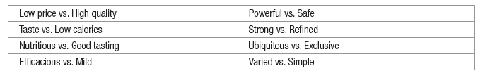 Points-of-difference should also be stated in positive, aspirational terms, like “Irresistible Taste,” “Superior Value,” Tireless Customer Service,” and “Unimpeachable Trust.” Points-of-parity are often stated in more muted terms to recognize the potential deficiencies they represent, such as “Sufficiently Accessible,” “Appropriately Relevant,” and “Fairly Priced.”