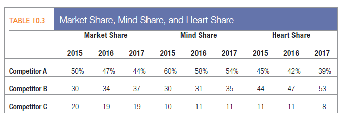 There’s an interesting relationship among these three measures. Table 10.3 shows them as recorded for three hypothetical competitors. Competitor A enjoys the highest market share but is slipping. Its mind share and heart share are also slipping, probably because it’s not providing good product availability and technical assistance. Competitor B is steadily gaining market share, probably due to strategies that are increasing its mind share and heart share. Competitor C seems to be stuck at a low level of market, mind, and heart share, probably because of its poor product and marketing attributes.