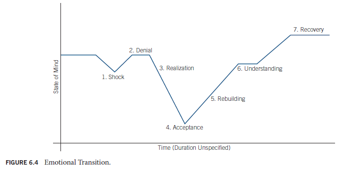 A great deal of research has been done about how people undergo transitions from one state of being to another. Most of this research has focused on the stages of transition or recovery that people go through when they confront a major unexpected and unwanted change in their lives. The types of changes that have been studied most include divorce, the death of a loved one, a life-threatening illness, and the loss of a job. Figure 6.4 illustrates the transition process people go through when confronted by one of these major traumatic changes in their lives.