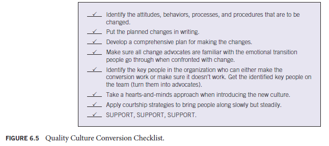Figure 6.5 provides a checklist managers can use to guide their organizations through the conversion to a quality culture. The various strategies contained in the checklist are explained in the following subsections: