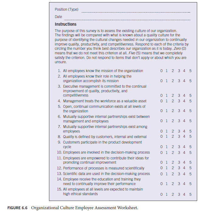 Does the organizations culture have these characteristics? The best way to answer this question is to involve the entire workforce from bottom to top in a systematic assessment that is stratified by level (executive management, middle management, first-line employee, etc.). Figure 6.6 is an example of an assessment instrument that can be used for collecting information on the perceptions of employees at all levels in an organization.