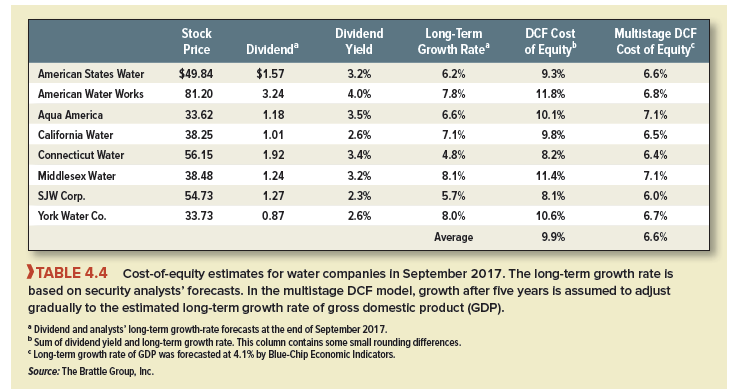 You could go on to valuation models with three or more stages. For example, the far right column of Table 4.4 presents multistage DCF estimates of the cost of equity for our local water companies. In this case the long-term growth rates reported in the table do not continue forever. After five years, each company’s growth rate gradually adjusts down to an estimated long-term 4.1% growth rate for gross domestic product (GDP). The reduced growth rate cuts the average cost of equity to 6.6%.
