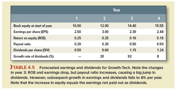 Table 4.5 shows what’s going on. Growth-Tech starts year 1 with book equity of $10.00 per share. It earns $2.50, pays out 50 cents as dividends, and plows back $2. Thus, it starts year 2 with book equity of $10 + 2 = $12. After another year at the same ROE and payout, it starts year 3 with equity of $14.40. However, ROE drops to .16, and the firm earns only $2.30. Dividends go up to $1.15 because the payout ratio increases, but the firm has only $1.15 to plow back. Therefore, subsequent growth in earnings and dividends drops to 8%.