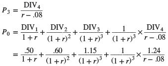 We have to use trial and error to find the value of r that makes P0 equal $50. It turns out that the r implicit in these more realistic forecasts is just over .099, quite a difference from our “constant-growth” estimate of .21.