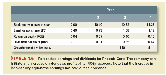 Growth rates can vary for many reasons. Sometimes, growth is high in the short run not because the firm is unusually profitable, but because it is recovering from an episode of low profitability. Table 4.6 displays projected earnings and dividends for Phoenix Corp., which is gradually regaining financial health after a near meltdown. The company’s equity is growing at a moderate 4%. ROE in year 1 is only 4%, however, so Phoenix has to reinvest all its earnings, leaving no cash for dividends. As profitability increases in years 2 and 3, an increasing dividend can be paid. Finally, starting in year 4, Phoenix settles into steady-state growth, with equity, earnings, and dividends all increasing at 4% per year.