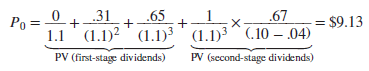 Our present value calculations for Growth-Tech used a two-stage DCF valuation model. In the first stage (years 1 and 2), Growth-Tech is highly profitable (ROE = 25%), and it plows back 80% of earnings. Book equity, earnings, and dividends increase by 20% per year. In the second stage, starting in year 3, profitability and plowback decline, and earnings settle into long-term growth at 8%. Dividends jump up to $1.15 in year 3, and then also grow at 8%.