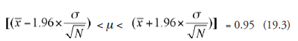 We notice that if we require a higher degree of confidence (99 percent instead of 95 percent), we end up with a wider confidence interval. It is desirable to have a combination of a higher degree of confidence and a narrower confidence interval. To look for the variables that influence these two somewhat conflicting outcomes, we go to (19.3) and note the following: Retaining a higher degree of confidence, to narrow the confidence interval, we need to increase the factor to the left of μ and decrease the factor to the right of μ. X being common to both sides, and σ being known and fixed, the only changeable factor is √N , or N, the sample size. To the extent that N, the number of elements in the sample, is higher, the lower limit of the confidence range (on left) increases and the upper limit (on the right) decreases, both together rendering the confidence range narrower. This confirms what we mentioned earlier—that larger samples should give us more confidence in estimating the population parameters. Incidentally, also note that if σ, the standard deviation, were given to be lower (say two instead of four in the example we considered), the effect would have been similar to having higher N, namely, rendering the confidence interval narrower.