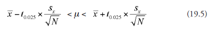 Substituting in (19.5), 2.262 in place of t0.025, X and sx calculated for the sample, nine in place of N, we can compute the numerical values of the lower and the upper limit of the required parameter, namely, the population mean, μ. We can accept it with 95 percent confidence.