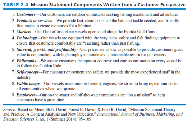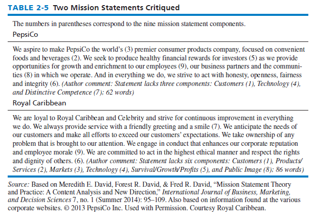 Perhaps the best way to develop a skill for writing and evaluating mission statements is to study actual company missions. Thus, Table 2-5 provides a component-by-component critique of two actual mission statements from PepsiCo, and Royal Caribbean. the Royal Caribbean statement includes only six of the nine components, comprises 86 words total, and lacks a customer perspective. The Royal Caribbean statement merely includes the word customer(s), which is inadequate to be considered written from a customer perspective.