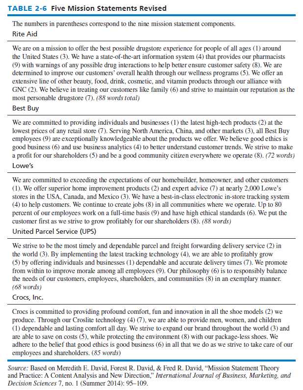 As additional guidance for practitioners (and students), five actual mission statements are revised/rewritten from a customer perspective and presented in Table 2-6. The improved statements include all nine components written from a customer perspective, and, additionally, are inspiring, concise, and comprised of fewer than 90 words each. regarding the “customer” component, the new Best Buy statement refers to “individuals and businesses”; the new Lowe’s statement refers to “homebuilders and homeowners”; and the improved Crocs statement refers to “men, women, and children.” In contrast, the Crocs, Best Buy, Rite Aid, and Lowe’s actual statements merely include (or not) the word customer or consumer. The statements are revised to potentially enhance customer satisfaction, especially if communicated to customers by marketers, and backed by company commitment to and implementation of the mission message. The proposed statement for the footwear company Crocs, Inc., for example, talks about “dependable and lasting comfort all day,” whereas the UPS proposed statement talks about “the most timely, dependable, and accurate delivery times in the world.”