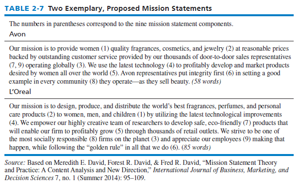 Proposed, exemplary mission statements for Avon and L’Oreal are provided in Table 2-7. These rival firms have uniquely different competitive advantages in that Avon utilizes door-to-door sales representatives to gain competitive advantage, whereas L’Oreal markets products in thousands of retail outlets. The proposed Avon and L’Oreal statements have the characteristics described earlier, and include the nine components written from a customer perspective. The proposed Avon statement includes the nine components in 58 words, and provides a basis for an emotional bond to be established between the firm and its customers. For example, the Avon statement reveals that if you purchase Avon products, you will be rewarded with “outstanding customer service provided by a personal sales representative who adheres to the highest ethical standards, while providing fragrances, cosmetics, and jewelry that exhibit the highest technological advancements.” There is quite a lot in that brief statement that an Avon customer can become loyal to, especially when the Avon marketing representative reinforces the statement with her actions.