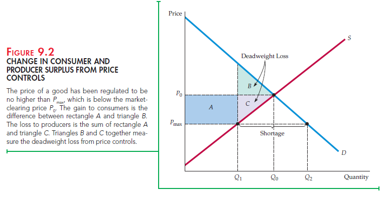 - Deadweight Loss: Is the loss to producers from price controls offset by the gain to consumers? No. As Figure 9.2 shows, price controls result in a net loss of total surplus, which we call a deadweight loss. Recall that the change in consumer surplus is A − B and that the change in producer surplus is −A − C. The total change in surplus is therefore (A − B) + (−A − C) = −B − C. We thus have a deadweight loss, which is given by the two triangles B and C in Figure 9.2. This deadweight loss is an inefficiency caused by price controls; the loss in producer surplus exceeds the gain in consumer surplus.