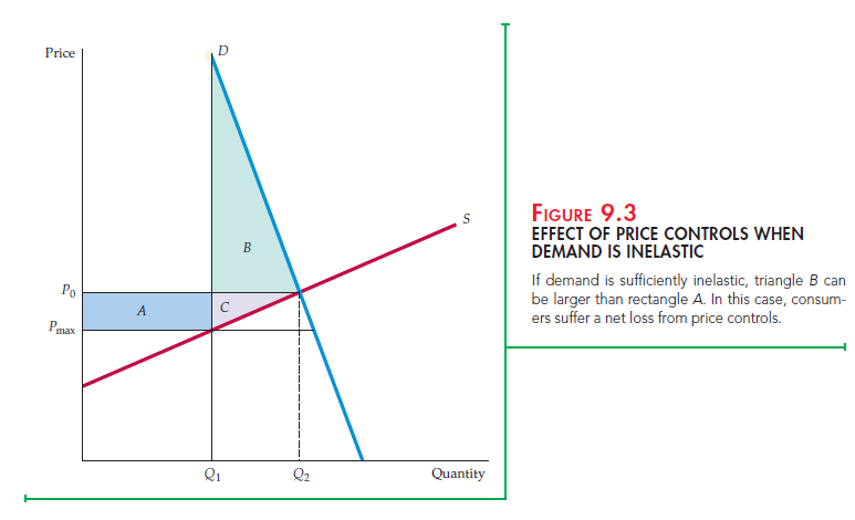 If politicians value consumer surplus more than producer surplus, this dead- weight loss from price controls may not carry much political weight. However, if the demand curve is very inelastic, price controls can result in a net loss of consumer surplus, as Figure 9.3 shows. In that figure, triangle B, which measures the loss to consumers who have been rationed out of the market, is larger than rectangle A, which measures the gain to consumers able to buy the good. Here, because consumers value the good highly, those who are rationed out suffer a large loss.