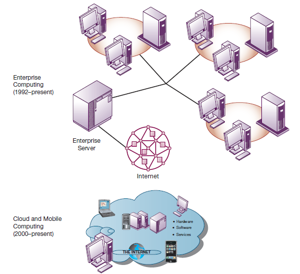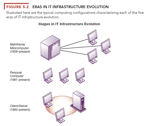 The IT infrastructure in organizations today is an outgrowth of more than 50 years of evolution in computing platforms. There have been five stages in this evolution, each representing a different configuration of computing power and infrastructure elements (see Figure 5.2). The five eras are general-purpose mainframe and minicomputer computing, personal computers, client/server networks, enterprise computing, and cloud and mobile computing.