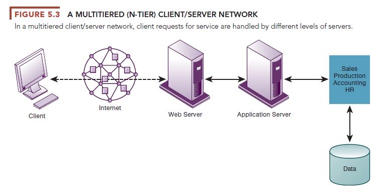 This is called a two-tiered client/server architecture. Whereas simple client/server networks can be found in small businesses, most corporations have more complex, multitiered client/server architectures (often called N-tier client/server architectures) in which the work of the entire network is balanced over several different levels of servers, depending on the kind of service being requested (see Figure 5.3).