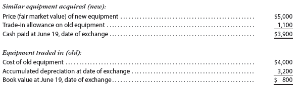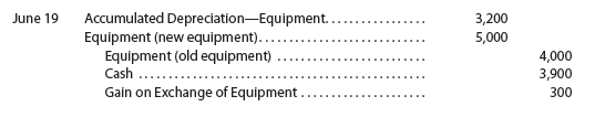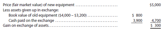 The gain on the exchange, $300, can also be determined as the difference between the fair market value of the new asset of $5,000 and the book value of the old asset traded in of $800 plus the cash paid of $3,900, as shown below.