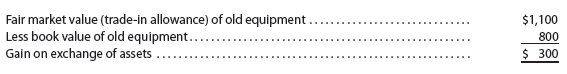 The gain on the exchange, $300, is the difference between the fair market value (trade-in allowance) of the asset given up (exchanged) of $1,100 and its book value of $800, as shown below.