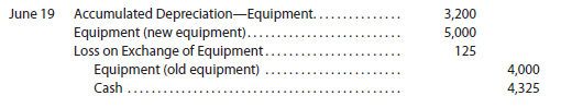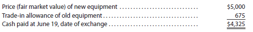To illustrate a loss on an exchange of similar assets, assume that instead of a trade-in allowance of $1,100, a trade-in allowance of only $675 was allowed in the preceding example. In this case, the cash paid on the exchange is $4,325 as shown below.
