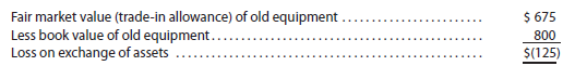 The loss on the exchange, $125, is the difference between the fair market value (trade-in allowance) of the asset given up (exchanged) of $675 and its book value of $800, as shown below.