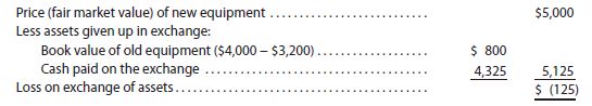 The loss on the exchange, $125, can also be determined as the difference between the fair market value of the new asset of $5,000 and the book value of the old asset traded in of $800 plus the cash paid of $4,325, as shown below.