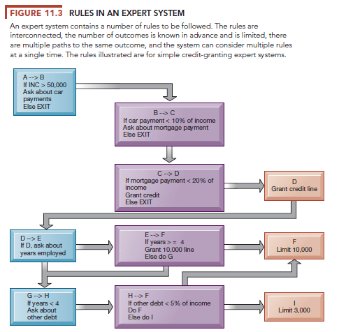Expert systems provide benefits such as improved decisions, reduced errors, reduced costs, reduced training time, and better quality and service. They have been used in applications for making decisions about granting credit and for diagnosing equipment problems, as well as in medical diagnostics, legal research, civil engineering, building maintenance, drawing up building plans, and educational technology (personalized learning and responsive testing) (Maor, 2003; Mishra, 2016). For instance, if you were the project manager of a 14-story office building and were given the task of configuring the building’s air conditioning system, which has hundreds of parts and subassemblies, an expert system could walk you through the process by asking a series of questions, producing an order to suppliers, and providing an overall cost estimate for the project, all in a matter of hours rather than weeks. See Figure 11.3 for an expert system for credit granting.