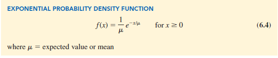 The exponential probability distribution may be used for random variables such as the time between arrivals at a hospital emergency room, the time required to load a truck, the distance between major defects in a highway, and so on. The exponential probability density function follows.