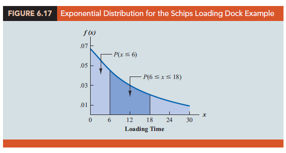As with any continuous probability distribution, the area under the curve corresponding to an interval provides the probability that the random variable assumes a value in that interval. In the Schips loading dock example, the probability that loading a truck will take 6 minutes or less, P(x < 6), is defined to be the area under the curve in Figure 6.17 from x = 0 to x = 6. Similarly, the probability that the loading time will be 18 minutes or less, P(x < 18), is the area under the curve from x = 0 to x = 18. Note also that the probability that the loading time will be between 6 minutes and 18 minutes, P(6 < x < 18), is given by the area under the curve from x = 6 to x = 18.