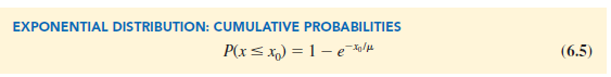 To compute exponential probabilities such as those just described, we use the following formula. It provides the cumulative probability of obtaining a value for the exponential random variable of less than or equal to some specific value denoted by x0.
