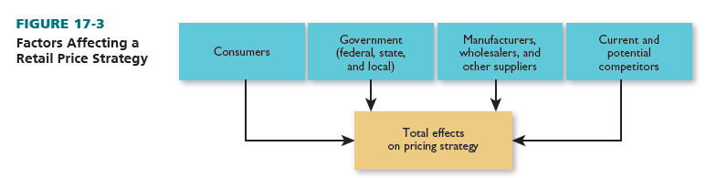 Several factors have an impact on a retail pricing strategy, as shown in Figure 17-3. Sometimes, the factors have a minor effect. In other cases, they severely restrict a firm’s pricing options.
