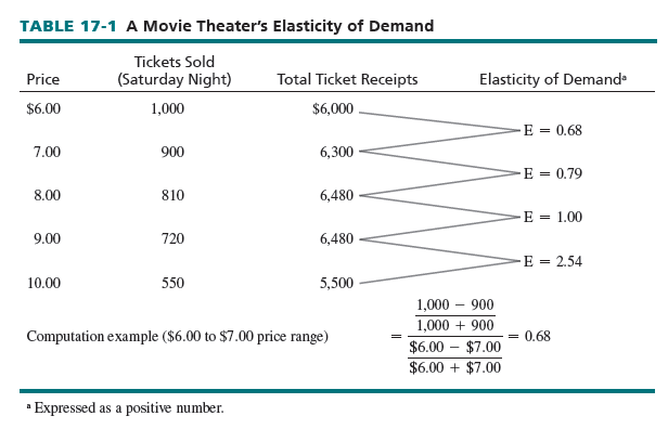 Table 17-1 shows price elasticity for a 1,000-seat movie theater (with elasticities converted to positive numbers) that offers second-run films. Quantity demanded (tickets sold) declines at each price from $6.00 to $10.00. Demand is inelastic from $6.00 to $7.00 and $7.00 to $8.00; ticket receipts rise since the percentage price change exceeds the percentage change in tickets sold. At $8.00 to $9.00, demand is unitary; ticket receipts are constant since the percentage change in tickets sold exactly offsets the percentage price change. Demand is elastic from $9.00 to $10.00; ticket receipts fall since the percentage change in tickets sold is more than the percentage change in price.