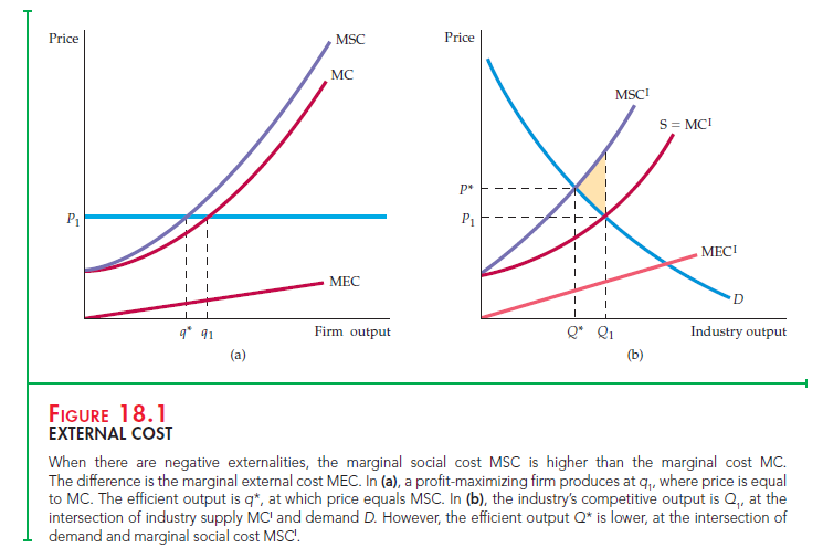 The price of steel is P1 at the intersection of the demand and supply curves in Figure 18.1 (b). The MC curve in (a) gives a typical steel firm’s marginal cost of production. The firm maximizes profit by producing output q1, at which marginal cost is equal to price (which equals marginal revenue because the firm takes price as given). As the firm’s output changes, however, the external cost imposed on fishermen downstream also changes. This external cost is given by the marginal external cost (MEC) curve in Figure 18.1 (a). It is intuitively clear why total external cost increases with output—there is more pollution. However, our analysis focuses on the marginal external cost, which measures the added cost of the externality associated with each additional unit of output produced. In practice, the MEC curve is upward sloping for most forms of pollution: As the firm produces additional output and dumps additional effluent, the incremental harm to the fishing industry increases.