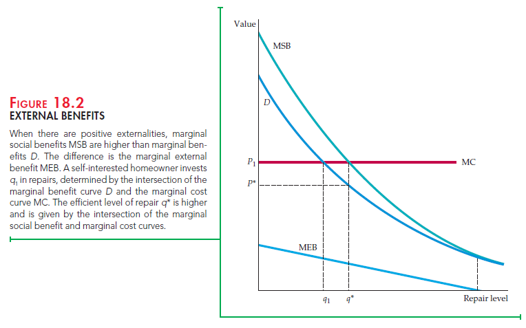 Externalities can also result in too little production, as the example of home repair and landscaping shows. In Figure 18.2, the horizontal axis measures the home owner’s investment (in dollars) in repairs and landscaping. The marginal cost curve for home repair shows the cost of repairs as more work is done on the house; it is horizontal because this cost is unaffected by the amount of repairs. The demand curve D measures the marginal private benefit of the repairs to the homeowner. The home owner will choose to invest q in repairs, at the intersection of her demand and marginal cost curves. But repairs generate external benefits to the neighbors, as the marginal external benefit curve, MEB, shows. This curve is downward sloping in this example because the marginal benefit is large for a small amount of repair but falls as the repair work becomes extensive.