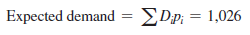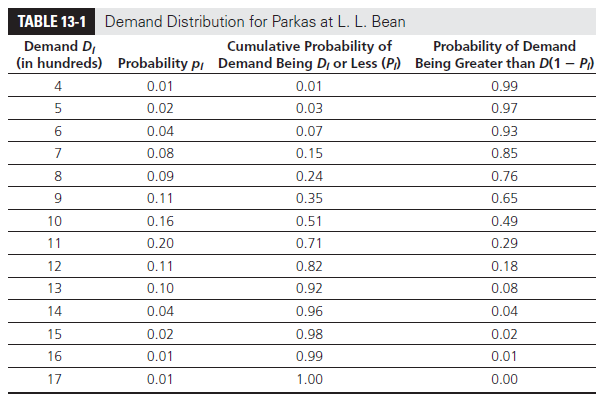 L.L. Bean has a buying committee that decides on the quantity of each product to be ordered. Based on demand over the past few years, the buyers have estimated the demand distribution for a women’s red ski parka to be as shown in Table 13-1. This is a deviation from its traditional practice of using the average historical demand as the consensus forecast. To simplify the discussion, we assume that all demand is in hundreds of parkas. The manufacturer also requires that L. L. Bean place orders in multiples of 100. In Table 13-1, pi is the probability that demand equals Di, and Pi is the probability that demand is less than or equal to Di. From Table 13-1, we evaluate the expected demand for parkas as