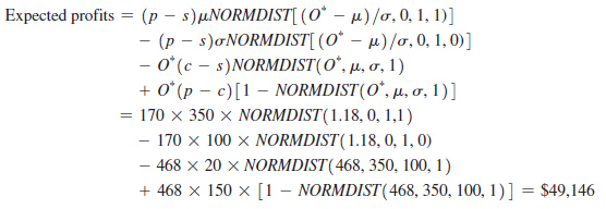The derivation of this formula is provided in Appendix 13B and Appendix 13C. Here, FS is the standard normal cumulative distribution function and fS is the standard normal density function discussed in Appendix 12A in Chapter 12. The expected profit from ordering 0 units is evaluated in Excel using Equations 12.22, 12.25, and 12.26, as follows: