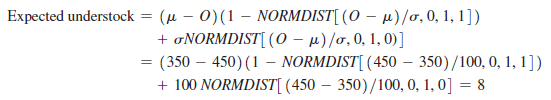 Demand for skis at Sportmart is normally distributed with a mean of m = 350 and a standard deviation of s = 100. The manager has decided to order 450 pairs of skis for the upcoming season. Evaluate the expected overstock and understock as a result of this policy.