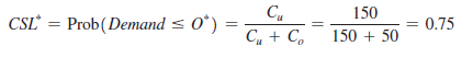 Cost of understocking = Cu = p – c = $200 – $50 = $150