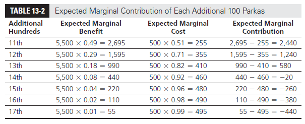 The total expected profit from ordering 1,100 parkas is thus $52,340, which is almost 5 percent higher than the expected profit from ordering 1,000 parkas. Using the same approach, we evaluate the marginal contribution of each additional 100 parkas as in Table 13-2 (see worksheet Table 13-1, 2 in spreadsheet Chapter13-examples). Note that the expected marginal contribution is positive up to 1,300 parkas, but it is negative from that point on. Thus, the optimal order size is 1,300 parkas. From Table 13-2, we have