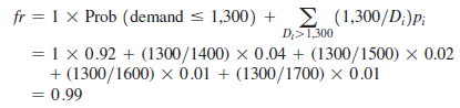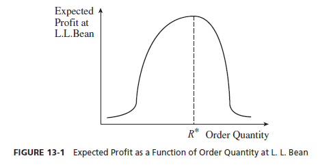 A plot of total expected profits versus the order quantity is shown in Figure 13-1. The optimal order quantity maximizes the expected profit. For L. L. Bean, the optimal order quantity is 1,300 parkas, which provides a CSL of 92 percent. Observe that with a CSL of 0.92, L. L. Bean has a fill rate that is much higher. If demand is 1,300 or less, L. L. Bean achieves a fill rate of 100 percent, because all demand is satisfied. If demand is more than 1,300 (say, D), part of the demand (D – 1,300) is not satisfied. In this case, a fill rate of 1,300/D is achieved. Overall, the fill rate achieved at L. L. Bean if 1,300 parkas are ordered is given by