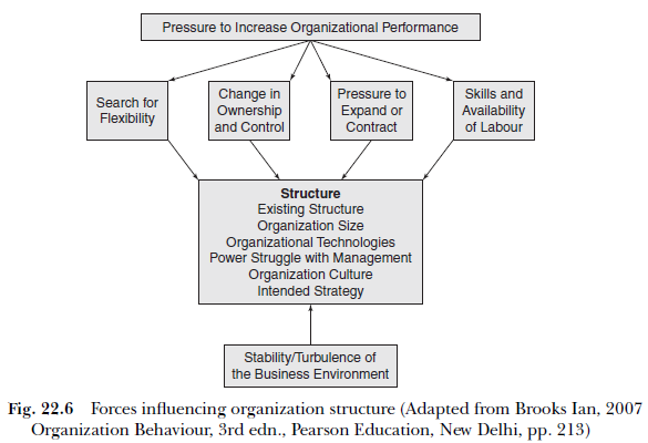 The following factors influence the formation of an organization structure. These factors can be classified into two categories: internal and external. Internal factors cover size of the organization, strategy evolved, management philosophy and the degree of control. Organization structure is impacted by various factors as shown in Figure 22.6 to enhance the organizational performance.