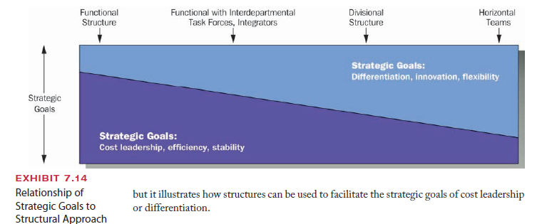 Exhibit 7.14 also illustrates how other forms of structure represent intermediate steps on the organization’s path to efficiency or innovation. The functional structure with cross- functional teams and project managers provides greater coordination and flexibility than the pure functional structure. The divisional structure promotes differentiation because each division can focus on specific products and customers, although divisions tend to be larger and less flexible than small teams. Exhibit 7.14 does not include all possible structures, but it illustrates how structures can be used to facilitate the strategic goals of cost leadership or differentiation.