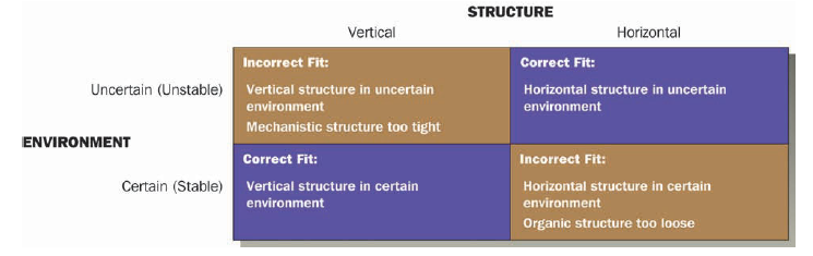 Not all organizations have to be as super-responsive to the environment as the USS Dwight D. Eisenhower, but using the correct structure for the environment is important for businesses as well. When managers use the wrong structure for the environment, reduced performance results. A rigid, vertical structure in an uncertain environment prevents the organization from adapting to change. Likewise, a loose, horizontal structure in a stable environment is inefficient. Too many resources are devoted to meetings and discussions when employees could be more productive focusing on specialized tasks.