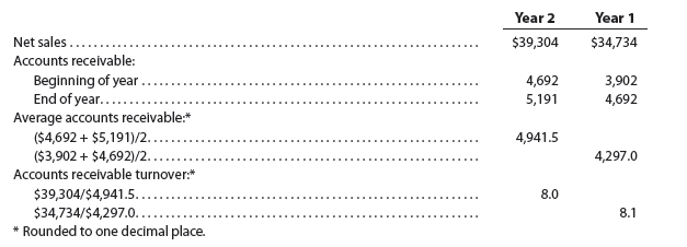 The average accounts receivable can be determined by using monthly data or by simply adding the beginning and ending accounts receivable balances and dividing by two. For example, using the following financial data (in millions) for FedEx, the Year 2 and Year 1 accounts receivable turnover is computed as 8.0 in Year 2 and 8.1 in Year 1, as shown below.