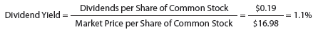 To illustrate, the market price of News Corporation was $16.98 on November 8, 2011. During the preceding year, News Corporation had paid dividends of $0.19 per share. Thus, the dividend yield of News Corporation’s common stock is computed as follows:
