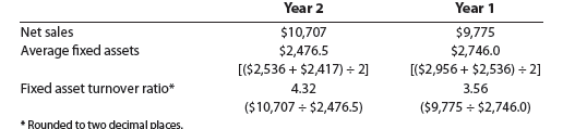 The higher the fixed asset turnover, the more efficiently a company is using its fixed assets in generating sales. For example, in Year 2 Starbucks earned $4.32 of sales for every dollar of fixed assets, which is more than $3.56 of sales for every dollar of fixed assets it earned in Year 1. Thus, Starbucks used its fixed assets more efficiently in Year 2.