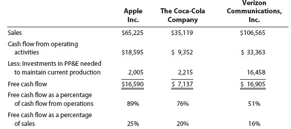 Research in Motion’s free cash flow was 74% of cash flow from operations and over 15% of sales. Compare this to the calculation of free cash flows for Apple Inc. (a computer company), The Coca-Cola Company (a beverage company), and Verizon Communications, Inc. (a telecommunications company), shown below (in millions):
