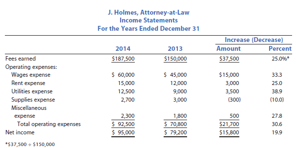 To illustrate, the horizontal analysis of two income statements for J. Holmes, Attorney- at-Law, is shown on the following page.