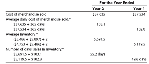 The average daily cost of merchandise sold is determined by dividing the cost of merchandise sold by 365. Based upon the preceding data, the number of days’ sales in inventory for Best Buy is computed below.